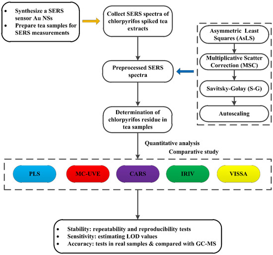 This study aimed to construct an efficient and convenient strategy for detecting trace-level chlorpyrifos residue in tea by employing SERS coupled with intelligent variable selection models. First, a seed-mediated method produced gold nanostars (Au NSs) as the SERS sensor. Second, the SERS spectra of chlorpyrifos-spiked tea extracts were measured by a portable Raman spectrometer. Subsequently, the collected SERS spectra were preprocessed by adopting a spectral data preprocessing strategy. Four intelligent variable selection models, including Monte Carlo-based uninformative variable elimination (MC-UVE), competitive adaptive reweighted sampling (CARS), iteratively retaining informative variables (IRIV), and variable iterative space shrinkage approach (VISSA), were developed. Then, these intelligent variable selection models, along with a PLS model, were used to predict chlorpyrifos residue in tea samples based on the preprocessed SERS spectra. A comparative study of the prediction results obtained by different models was carried out. The proposed strategy’s stability and sensitivity were confirmed by the repeatability and reproducibility tests and the calculated limit of detection (LOD) values. To verify the proposed strategy’s accuracy, the paired t-tests were conducted on the detection results yielded by the proposed strategy and those produced by the GC-MS method. In this study, the schematic diagram of the experimental design is shown in Figure 1.