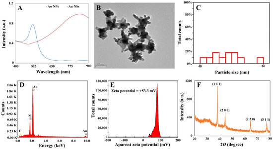 (A) The UV–Vis extinction spectrum of Au NSs. (B) The TEM image of Au NSs. (C) The statistical histogram of the particle size of Au NSs. (D) The EDS of Au NSs. (E) The zeta potential of Au NSs. (F) The XRD pattern of Au NSs.