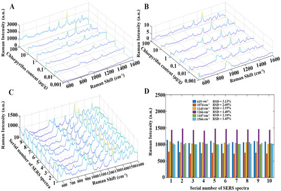 The SERS spectra of chlorpyrifos-spiked tea extracts were measured using Au NSs. Figure 5A shows six raw SERS spectra of chlorpyrifos-spiked tea extracts over the 0.001–100 μg/g concentration range. According to the theoretical molecular vibrations of chlorpyrifos calculated by the density functional theory (DFT) in a previous report [45], six primary characteristic peaks found at 619, 1074, 1143, 1266, 1447, and 1566 cm−1 were assigned to P=S stretching, P-O-C stretching, C-H wagging, ring stretching, C-H wagging, and C=C stretching, respectively. From the perspective of the molecular structure of chlorpyrifos, an internal P=S double bond is responsible for its strong adsorption to metal ions, forming new covalent bonds such as Au-S, Ag-S, and Cu-S [46]. The high affinity of chlorpyrifos toward metal ions facilitated its Raman signal amplification. The proposed spectral preprocessing approach was then applied to the six raw SERS spectra, and the resultant SERS spectra are shown in Figure 5B. The preprocessed SERS spectra were smoother, and the baseline interference was removed, both of which were advantageous for subsequent quantitative analysis. Figure 5C shows 10 raw SERS spectra of chlorpyrifos-spiked tea extracts with a concentration of 1 μg/g, and the relative standard deviation (RSD) values of the Raman intensities at six characteristic peaks were computed. As shown in Figure 5D, the computed RSD values were all less than 5.0%, which implied the high consistency of the measured SERS spectra and the excellent repeatability of the Au NSs.