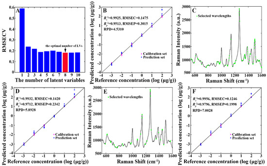 VISSA was used to select the valuable wavelengths from the SERS spectra and develop a multivariate calibration model, which was then used to predict chlorpyrifos residue concentration in tea samples. As shown in Table 1, the constructed VISSA model obtained the following results: nLVs = 10, nWAV = 78, RMSEC = 0.1135, = 0.9968, RMSEP = 0.1580, = 0.9892, and RPD = 9.6246. Figure 7D shows the wavelengths chosen by the VISSA model. Among these 78 selected wavelengths, the wavelengths at 615, 617, 619, 622, 624, 1067, 1069, 1071, 1073, 1075, 1141, 1143, 1145, 1147, 1264, 1266, 1268, 1269, 1443,1445, 1447, 1449, 1562, 1564, 1566, and 1568 cm−1 were in the neighborhood of the characteristic peaks of chlorpyrifos: 619, 1074, 1143, 1266, 1447, and 1566 cm−1. A scatter plot illustrating the correlation between the reference and the VISSA model’s predicted chlorpyrifos residue concentration is presented in Figure 7E.