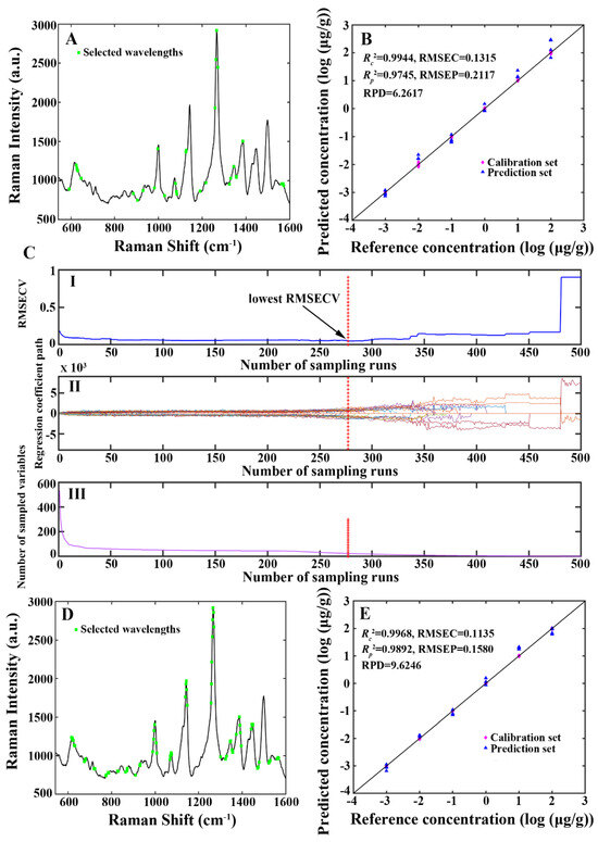 CARS was adopted to select the valuable wavelengths from the SERS spectra and develop a multivariate calibration model, which was then used to predict chlorpyrifos residue concentration in tea samples. As shown in Table 1, the developed CARS model obtained the subsequent outcomes: nLVs = 9, nWAV = 23, RMSEC = 0.1315, = 0.9944, RMSEP = 0.2117, = 0.9745, and RPD = 6.2617. Figure 7A shows the wavelengths chosen by the CARS model. Of these 23 chosen wavelengths, the wavelengths at 624, 626, 628, 1077, 1081, 1258, 1262, 1266, 1271, 1562, 1569, and 1572 cm−1 were in the neighborhood of the characteristic peaks of chlorpyrifos: 619, 1074, 1266, and 1566 cm−1. A scatter plot illustrating the correlation between the reference and the CARS model’s predicted chlorpyrifos residue concentration is presented in Figure 7B. Figure 7C-I displays the change in RMSECV values for various MC sampling runs. The RMSECV values decreased during sampling runs 1 to 277 as the uninformative or interfering wavelengths were eliminated. Subsequently, the RMSECV values increased during sampling runs 290 to 500 due to the informative wavelengths being removed. Figure 7C-II and Figure 7C-III display the regression coefficient path and the number of sampled variables corresponding to various sampling runs. It can be seen from Figure 7C-III that the progress of variable selection of CARS was split into two steps: first, the wavelengths were eliminated rapidly, which implied a “fast selection” phase; second, the wavelengths were eliminated gradually, which signified a “refined selection” phase.