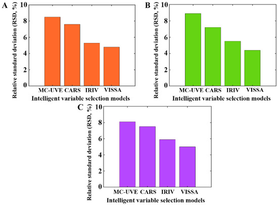LOD is a crucial metric that was used to assess the sensitivity of the proposed strategy. Based on the mean relative error (MRE) evolution method proposed by Oleneva et al. (detailed in Supplementary Materials) [47], the estimated LOD values of the various models were as follows: LODMC-UVE = 5.6 × 10−4 μg/g, LODCARS = 5.1 × 10−4 μg/g, LODIRIV = 4.5 × 10−4 μg/g, and LODVISSA = 3.9 × 10−4 μg/g. The MRL of chlorpyrifos in tea set by the European Union is 0.01 mg/kg (1.0 × 10−2 μg/g). The estimated LOD values of all the models were lower than the MRL value. Hence, the sensitivity of the proposed method is qualified to determine chlorpyrifos residue in tea samples accurately.