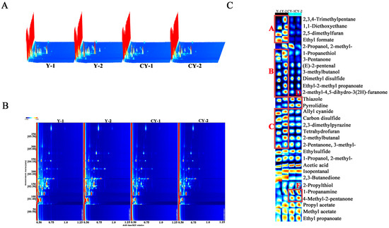 (A) Three-dimensional spectrogram of Y and CY. (B) Two-dimensional top view of Y and CY. (C) Fingerprints of VOCs in Y and CY.