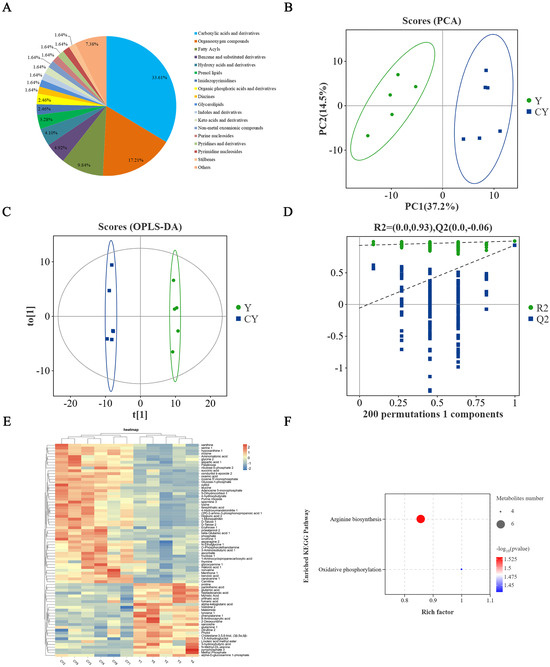 (A) Pie chart of the number of different types of 122 non−volatile metabolites in yak and cattle−yak meat. (B) PCA model. (C) OPLS−DA model. (D) Permutations test plot of OPLS−DA model. (E) Heatmap of differential metabolites. (F) Pathway enrichment of differential metabolites.