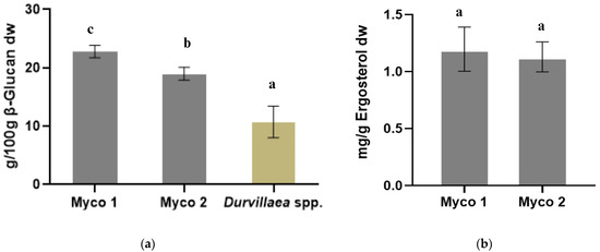 Beta-glucan content (a) and ergosterol content (b) in Myco 1, Myco 2, and Durvillaea spp. samples. Values are presented as mean ± SD. Bars with different letters indicate significant differences (p < 0.05). All values are based on dry weight (dw) analysis. The different bar colours are used solely for visual distinction between the data for Myco and Durvillaea spp. and do not represent any additional variable.