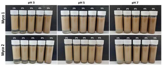 For both Myco 1 and Myco 2, the results indicated that the emulsifying capacity depended on the concentration. The results suggest that the emulsion stability improves with a gradual increase in the concentration of the mycoprotein. Furthermore, as visually depicted in Figure 2, there were no apparent signs of macroscopic oil leakage at the top of the tubes, confirming the good stability of the emulsion. Additionally, a slight improvement in the EC values was observed at pH 3, where values of approximately 100% were achieved between 4% and 5%. In addition, a slight improvement in the EC values was observed at pH 3, where the values were slightly greater than those of the emulsions stabilized at pH 3 and 7. This improvement could be attributed to the fact that the ionic compounds present in the mycoprotein may be influenced by pH changes, which enhances their interfacial activity at this pH. According to Pacwa-Plociniczak et al. [95], bioemulsifiers containing amphiphilic polysaccharides, proteins, lipopolysaccharides, lipoproteins, or complex mixtures of these biopolymers are effective at stabilizing O/W emulsions. The presence of proteins and polysaccharides in the mycoprotein may play a relevant role in the formation and stabilization of emulsions due to its amphiphilic nature. Moreover, one criterion used to identify a bioemulsifier is its ability to maintain at least 50% of the original emulsion volume after 24 h [96]. Consequently, both Mycoseaweed’s mycoprotein samples can be included in this family of compounds.