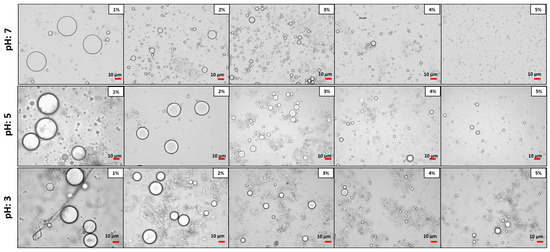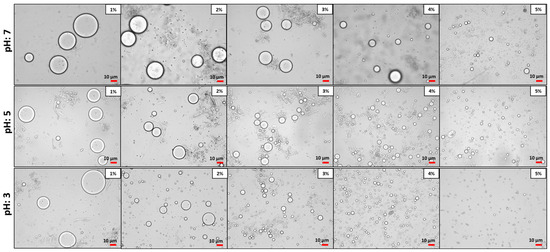 Optical micrographs of the O/W Pickering emulsions stabilized at different Myco 2 concentrations (1.0–5.0%, w/w). The images were acquired at 40× magnification.