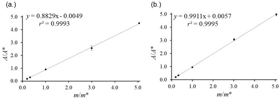 IDMS requires a linear response of analyte and isotopologue. The signal area ratios A(13C3–MEL)/A(MEL) or A*/A versus the corresponding mass fractions m(13C3–MEL)/m(MEL) or m*/m results in a straight line through the origin with a defined slope, indicating no interferences or instrumental biases between labeled and unlabeled compounds [32]. The evaluation of the signal areas as a function of weighing ratios shows a straight line with r2 > 0.999 (Figure 2). The area ratio of CYA/13C3–CYA and MEL/13C3–MEL in the calibration blend RBC and the sample blend RB should be within 0.95–1.15 and their corresponding ratio RB/RBc should be close to unity for minimum measurement uncertainty and instrumental bias.