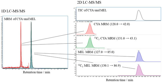 In the present study, CYA/13C3–CYA and MEL/13C3–MEL were used. However, with regard to matrix removal and matrix effect, a heart–cut 2D–LC method was developed and compared to the 1D–LC. For the 2D–LC, the retention time (RT) of the MS signals must not vary more than 0.05 min. Otherwise, the system must be equilibrated longer. Furthermore, the signal area of CYA and MEL in 2D should be constant. Figure 3 shows the chromatogram(s) of the PT 30110 sample (FERA/FAPAS®) 30110 extract spiked with 13C3–CYA and 13C3–MEL with an RT of 2.8 min for CYA and RT 4.4 min for MEL in 1D, and an RT of 4.0 min for CYA and RT 5.7 min for MEL in 2D. The analysis time nearly doubled for the LC × LC. However, a negligible slope deviation was observed with low impact on the resulting signal ratios.