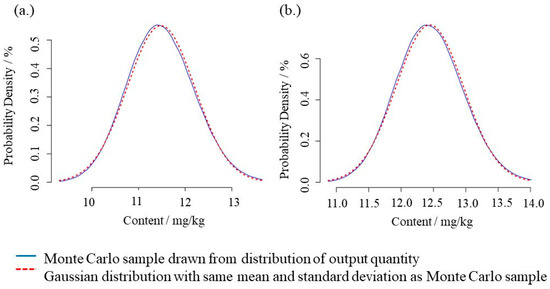 Distribution of output quantity calculated from the MCS results of the NIST Uncertainty Machine for CYA (a) and MEL (b) of the EMD–IDMS measurements of the PT 30110 sample (FERA/FAPAS®, 2021) using Equation (1) and the parameter set in Table 2 for the NIST Uncertainty Machine. Due to the symmetric Gaussian distribution of the simulated results, the mean values and standard deviations do not differ significantly from median and coverage interval with 95% probability. The other numerical results are presented in Table 3.