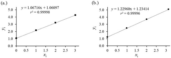 Since there are no overlapping contributions of the “spike” to the amount ratios of “sample” or “reference”, the “eq. A12” in the manuscript by Brauckmann et al. [21], Equation (3), simplifies to Equation (4) under the constraints that the amount fraction of the target analyte (denoted as 1) in the “spike” is xy1 = 0 and the amount fraction of the “spike” (denoted as 2) in the sample is also xx2 = 0. Equation (5) represents the linearized form with the dimensionless y-axis values of the ternary mixtures i, the corresponding x-axis values, and the definition of slope a1 and intercept a0.
