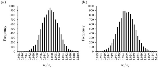 (a) Distribution of the simulated results for the case of a single CYA CRM stock solution representing sample x and reference z. The target value is 1. The coverage interval ranges from 0.961 to 1.030 with 95% confidence (N = 10,000). (b) Distribution of the simulated results for the case of a single MEL CRM stock solution representing sample x and reference z. The target value is 1. The average value is 1.005 with a coverage interval of 0.937–1.071 (95% confidence). A reasonable distribution with N = 10,000 results.
