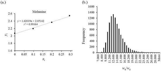 (a) Standard addition results of the binary and ternary mixtures of one CYA and 13C3–CYA stock solution using Equation (6) for the calculation of yi and xi. Linear regression shows a very good fit. Slope and intercept result in a good agreement with the target value wX/wZ = 0.994 with u(wX/wZ) = 0.009. Including the outliers leads to the result wX/wZ = 0.979 with u(wx/wZ) = 0.021. A t-test for the comparison of the expected value 1 to the measured value results t(n = 8, α = 0.975) = 1.89 < 2.36. (b) Standard addition results of the binary and ternary mixtures of one MEL and 13C3–MEL stock solution using Equation (6) for the calculation of yi and xi. Linear regression shows a very good fit. Slope and intercept result in a good agreement with the target value wX/wZ = 1.004 with u(wX/wZ) = 0.012. A t-test for the comparison of the expected value 1 to the measured value results t(n = 8, α = 0.975) = 0.94 < 2.36.