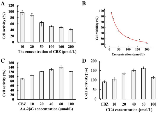 Effects of different concentrations of CBZ on activity of PC12 cells (A) and dose–response curve of PC12 cells exposed to CBZ alone for 24 h (B); effects of different concentrations of AA-2βG (C) and CGA (D) on activity of PC12-damaged cells.