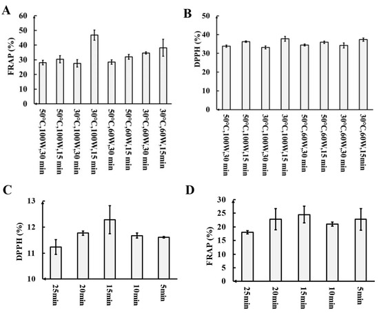 The overall antioxidant capacity of fresh LBE obtained using eight different extraction conditions was determined by the FRAP method. As shown in Figure 2A, the highest total antioxidant capacity was observed after fresh LBE treatment for 15 min at 30 °C with 100 W of ultrasound, resulting in a FRAP value of 49.48%.