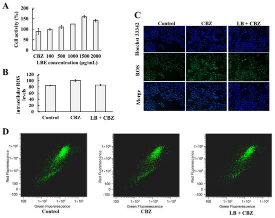 Four groups, namely the blank group, control group, CBZ-induced group, and LBE treatment group, were used in the present study. The use of the blank group, control group, and CBZ-induced group was in accordance with Section 2.3. The treatment group was preincubated with varying concentrations of LBE (100, 500, 1000, 1500, and 2000 μg/mL) for 2 h. Then, CBZ was added to the wells of both the CBZ-induced group and the treatment group. After a 24 h incubation period, the cellular viability was assessed.