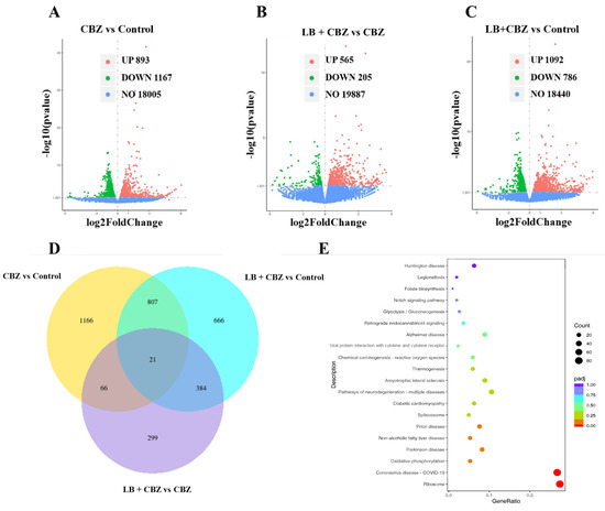 Volcano plot of differential genes for CBZ vs. control (A), LB + CBZ vs. CBZ (B), and LB + CBZ vs. control (C); Venn diagram of differential genes across comparison groups (D); LB + CBZ vs. CBZ group KEGG enrichment analysis scatter plot (E).