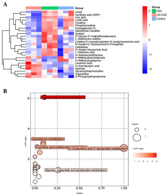 Heatmap of hierarchical clustering analysis of 25 differential metabolites (A) and metabolic pathway analysis for LB + CBZ vs. CBZ vs. control group (B). Note: the size and color of the circle represent the pathway effect and pathway significance, respectively.