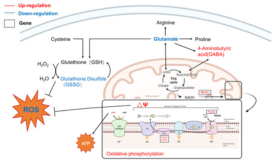 Combined with the results of the ROS levels and MMP changes in PC12 cells, as well as transcriptomics and targeted metabolomics, it was concluded that the effects of LBE were associated with mitochondrial homeostasis, ATP production, and the GSH/peroxidase oxygen-reactive protein system (Figure 6). The pathways of D-glutamine and D-glutamate metabolism; cysteine and methionine metabolism; GSH metabolism; and alanine, aspartate, and glutamate metabolism were significantly enriched following pretreatment with LBE. This was related to the significant observed changes in the expression of ribosomal-related genes and the GO and KEGG results described in Section 3.4.3. Among these amino acids, cysteine and glutamate are involved in the GSH cycle for the removal of excess ROS in the cell. Moreover, other amino acids, such as glutamate, 4-aminobutyric acid (GABA), and aspartic acid, participate in the TCA cycle to produce substrates for OXPHOS in the ETC. After LBE treatment, the upregulation of OXPHOS subunits such as Uqcrq, Cox7c, and Ndufa indicated the reversal of ETC inhibition and restoration of the MMP, thus preventing the generation of excessive ROS caused by mitochondrial damage. In summary, LBE maintains redox homeostasis by (i) activating OXPHOS and restoring the MMP to prevent mitochondrial damage; (ii) maintaining the stability of the TCA cycle through the regulation of amino acid metabolic disorder to generate ATP; and (iii) regulating the GSH metabolic pathway to remove excess ROS in cells.
