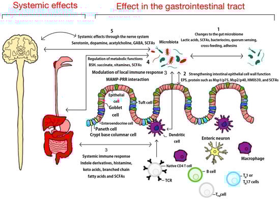 They are composed of carbohydrate elements with peptide, teichoic acid, and plasmalogen structures and are classified on the basis of various complex molecules such as p40 and p75 molecules, lactose, B vitamins, proteins of butyrate, acetate, lactate, and propionate, and organic acids 3-phenylactic acid and propionate. They are promising therapeutic agents for the prevention of gastrointestinal diseases and are considered as therapeutic technologies due to their mild side effects [71]. These mechanisms are illustrated in Figure 1.