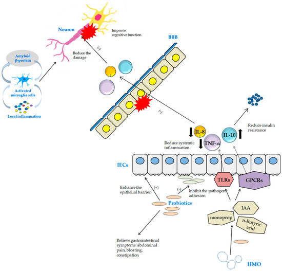 The role of probiotics in cancer prevention and treatment is particularly prominent in colorectal cancer. Probiotics have been shown to reduce the risk of colorectal cancer and inhibit tumor growth [118]. Most probiotics are part of the natural gut flora and include Lactobacillus, Bifidobacteria, Lactococcus, Streptococcus, Enterococcus, Gram-positive bacteria belonging to the genus Bacillus, and some strains of yeast belonging to the genus Saccharomyces [119]. These probiotics can directly modulate and improve the host’s gut microbiota as a novel colorectal cancer treatment modality [120]. And for the prevention and treatment of cancer, it reverses inflammatory changes and abnormal proliferation caused by the imbalance of intestinal flora, resulting in lesions and the antitumor effect of the intestinal tract, improving the function of the intestinal barrier, regulating immunity, degrading carcinogenic compounds in the intestine, and inducing cancer cell death and antiproliferative effects [121,122]. The anti-cancer mechanisms of action of probiotics are anti-inflammatory and antioxidant, suggesting that they may improve disease management by promoting a healthy gut microbiome in the prevention and management of T2DM [123]. Furthermore, it reduces metabolic stress in T2D patients and has potential as an adjunct for the prevention and treatment of T2D by improving carbohydrate metabolism, fasting blood glucose, insulin sensitivity, and antioxidant status [124]. There is also recent research suggesting that probiotics may be involved in reducing the risk of developing Alzheimer’s disease and improving cognitive function. In AD, which is characterized by cognitive and memory impairment in the presence of Aβ and neurofibrillary tangles (NFTs), alterations in gut microbiota diversity and defects in the gut–brain axis have been linked to AD [125]. This can be approached by improving neurocognitive function and gastrointestinal symptoms, which are potential mechanisms of probiotics. Probiotics improve gastrointestinal symptoms of abdominal pain, bloating, and constipation in patients by strengthening the intestinal wall and inhibiting the adhesion of pathogenic bacteria [126]. They also use human milk oligosaccharides (HMOs) as a substrate to break down metabolites such as acetic acid, and SCFAs and bacterial metabolites act on antigen-presenting cells (APCs) and intestinal epithelia cells (IECs) through G protein-coupled receptors (GPCRs). This leads to a reduction in systemic inflammation of pro- and anti-inflammatory cytokines through the nuclear factor kappa-light chain enhancer of activated B cells, (NF-κB), and mitogen-activated protein kinase (MAPK) pathways [127,128]. The potential mechanisms by which probiotics act are illustrated in Figure 2.