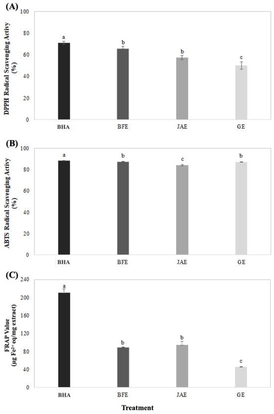 Radical scavenging activities of (A) DPPH and (B) ABTS and reducing power of (C) FRAP assay for BFE, JAE, and GE. BHA, butylated hydroxy anisole; BFE, balloon flower root; JAE, Japanese apricot; GE, grape extract. a–c Means with different superscripts in the values are significantly different at p < 0.05 by Duncan’s multiple range test.