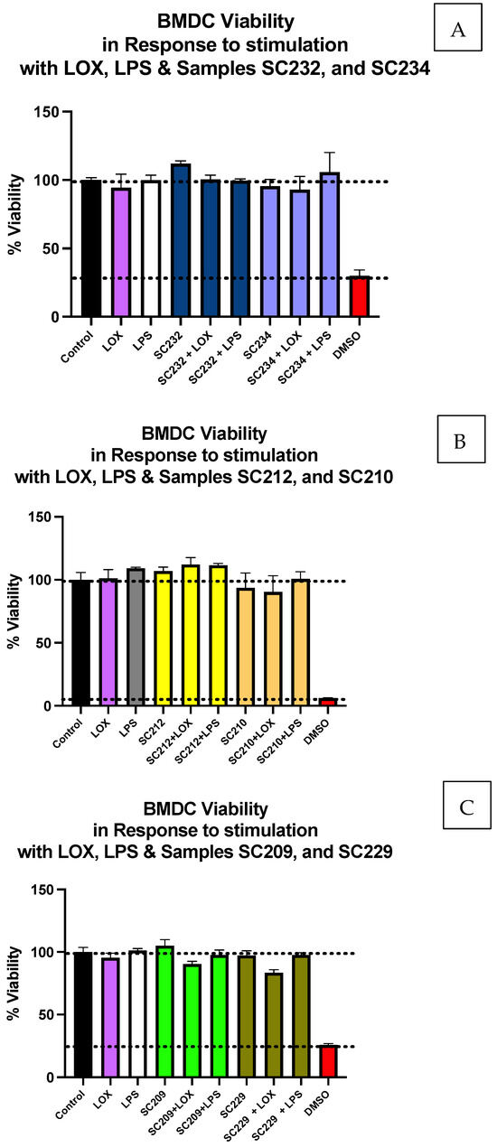 Exposure of LOX- and LPS-activated BMDCs to 25 mg/mL fermentates does not affect cell viability. BMDCs were seeded at 1 × 106 cells/mL and incubated overnight at 37 °C in 5% CO2. The following day, the cells were stimulated with 25 mg/mL of the following fermentates: (A) SC212 and SC210; (B) SC232 and SC234; or (C) null SC209 and SC229. These were incubated for 1 h at 37 °C in 5% CO2 and subsequently exposed to LOX 0.5 mM and LPS 100 ng/mL before being incubated overnight under the same conditions. After 24 h, the cells were incubated with MTS CellTiter Aqueous One Solution for 3 h at 37 °C in 5% CO2. Viability is represented as a percentage, comparing the samples to viable untreated control cells. Data are presented as the mean ± SEM of three replicates.