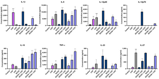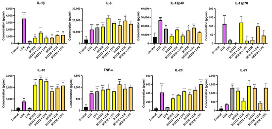 Figure 2 shows that our novel fermentates SC232 and SC234 significantly affected the secretion of cytokines in response to immune challenges with LOX and LPS when compared to the respective control/TLRs in BMDCs. IL-1β (p < 0.001), IL-6 (p < 0.001), IL-12p40 (p < 0.002), and TNF-α (p < 0.033) were significantly increased in the presence of LOX, with only low levels of IL-10, IL-23, and IL-27, and no IL-12p70 detectable. IL-6, IL-12p40, and IL-27 were significantly increased in the presence of LPS (p < 0.001), as well as TNF-α (p < 0.002), with only low levels of IL-1β, IL-10, and IL-23, and similarly no IL-12p70. The concentrations of IL-12p70 secreted were so low that it was not considered statistically significant.