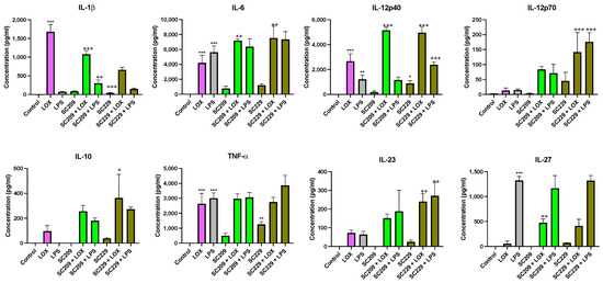 In the presence of LOX, SC209 increased IL-12p40 (p < 0.001), IL-6 (p < 0.002), and IL-27 (p < 0.002), but decreased IL-1β (p < 0.001). SC229 increased IL-12p40 (p < 0.001) and IL-6 (p < 0.002) in the presence of LOX. In the presence of LPS, SC209 increased IL-1β (p < 0.002). In contrast, SC229 increased IL-12p40 (p < 0.001) in the presence of LPS but had no significant effect on the other cytokines. Interestingly, in the absence of TLR stimulation, SC229 increased IL-1β (p < 0.001), TNF-α (p < 0.002), and IL-12p40 (p < 0.033). In contrast, SC209 had no significant effect on any cytokines secreted in the absence of TLR stimulation.