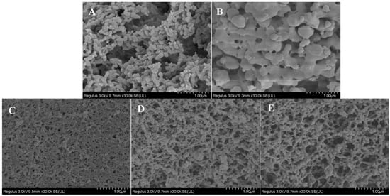 SEM images of WT-SDF (A), UT-SDF (B), UST-SDF (C), UET-SDF (D), and UMT-SDF (E) with a magnification of 30,000× at 1 µm.