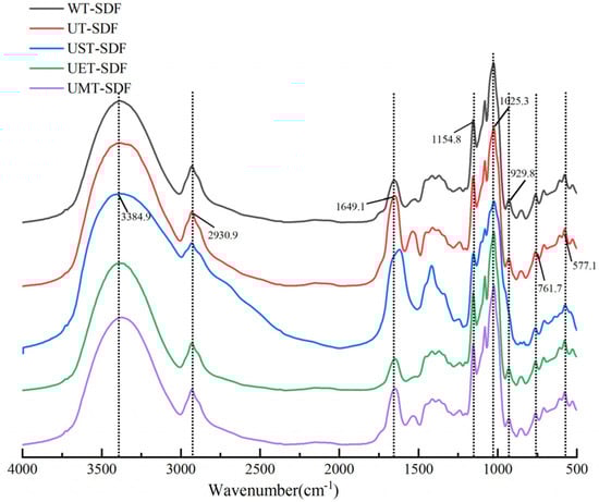 The FT-IR spectra of the SDF samples extracted by various methods were recorded within the range from 400 cm−1 to 4000 cm−1. As shown in Figure 2, several similar characteristic peaks are observed in the spectra of the five SDF samples. The strong and wide peak at 3384 cm−1 correlates with the -OH stretching of hydrogen bonds with polysaccharides [18]. Compared with other samples, the UST-SDF exhibited a peak intensity reduction at 2930 cm−1, which is a typical absorption peak of polysaccharide compounds, owing to the C-H stretching vibration of the methylene group of the polysaccharides [23,24]. This could probably be caused by the breakage of bonds in the molecule by sodium hydroxide treatment. The absorption peak at 1649 cm−1 might be an asymmetric vibration of C=O in the carboxyl group [25]. The peaks at 1200–1400 cm−1 were caused by the angular vibration of C-H, which is the characteristic absorption peak of sugars. The spectra of the five SDF samples showed slight differences in this region, especially that of the UST-SDF. The strong absorption peaks at 1154 cm−1 and 1025 cm−1 are related to the stretching vibration of C-O in C-O-C and the angular vibration of O-H in C-O-H, respectively, which are also characteristic absorption peaks of polysaccharides. Additionally, the peak at 930 cm−1 corresponding with the stretching vibration of β-glycosidic linkages was observed in all samples except the UST-SDF sample, demonstrating the degradation of polysaccharide chains caused by sodium hydroxide [26]. The positions of the characteristic absorption peaks in the FT-IR spectra showed no significant changes; however, the intensities of some peaks changed slightly, which may be due to the redistribution of cellulose caused by the different treatment methods.