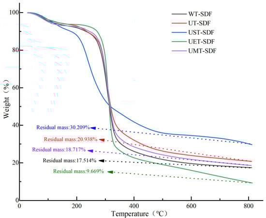 Figure 3 shows the TGA results for the SDF samples. The curves of the five SDF samples exhibited similar trends, and were divided into three temperature ranges. In the first set of temperature ranges (20 °C–200 °C), the curve changed relatively smoothly, and the weight of the sample was decreased slightly, mainly because of the loss of dehydration [27]. In the second set of temperature ranges (200 °C–400 °C), the maximum weight loss was observed, which might be related to the pyrolysis of polysaccharides and hemicellulose [28]. In the final set of temperature ranges (400 °C–800 °C), the weight loss of the SDF samples slowed, mainly due to carbon decomposition. In addition, the residual masses of the WT-SDF, UT-SDF, UST-SDF, UET-SDF, and UMT-SDF were 17.514%, 20.938%, 30.209%, 9.669%, and 18.717%, respectively, indicating better thermal stability of the UST-SDF. Overall, the SDF samples were relatively stable below 200 °C.