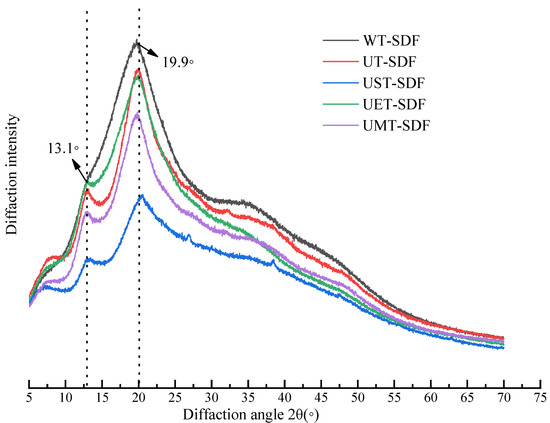 XRD was employed to characterise the crystalline morphologies of the polymers. As shown in Figure 4, all the SDF samples had typical crystalline peaks at 13.1° and 19.9°, whereas the prominent diffraction peak was around 19.9°, which is considered a typical structure of cellulose type I. All the SDF samples showed similar XRD patterns, indicating that these extraction methods did not significantly alter the crystal structure of the SDF. Among all the samples, the UST-SDF had the highest crystallinity, followed by the WT-SDF. The crystal structure of SDF is mainly maintained by hydrogen bonds formed between adjacent hydroxyl groups [29]. UT, cellulase hydrolysis, and microwave treatment can result in the degradation of the glycosidic bonds in SDF, resulting in a lower crystallinity of UT-SDF, UET-SDF, and UMT-SDF. The UST-SDF had small diffuse diffraction peaks near 26.9° and 38.3°, as evidenced by the presence of partial crystallisation [8], which is consistent with the UST-SDF having the highest crystallinity of all the SDF samples. This might be due to the combined treatment with ultrasound and alkali, which makes the molecular rearrangement more regular. The UMT-SDF had the lowest crystallinity, suggesting that its crystal structure was severely damaged by the ultrasonic microwaves.
