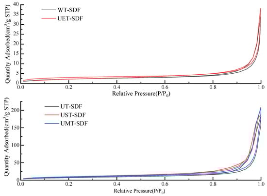 The specific surface areas and pore sizes of the SDFs are listed in Table 1. The specific surface areas of the WT-SDF, UT-SDF, UST-SDF, UET-SDF, and UMT-SDF were 7.95, 26.66, 37.86, 10.57, and 31.38 m2/g, respectively, with pore sizes of 17.25, 28.33, 26.16, 15.33, and 27.94 nm, respectively. Compared to the WT-SDF, the specific surface area of the other SDF samples increased, and the effect of ultrasonic-assisted NaOH or microwave treatment on the specific surface area increase of the SDF was more obvious than that of UT alone. Moreover, the nitrogen adsorption–desorption isotherms of all the SDF samples were depicted as a V-type isotherm with an H3-type hysteresis loop (Figure 5). In the higher p/p0 region, the rate of isotherm ascent increased, and H3-type hysteresis loops were formed, indicating the presence of mesopores and stacking in the SDFs.