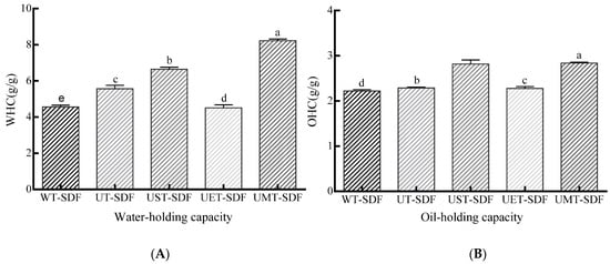 The WHC (A) and OHC (B) of WT-SDF, UT-SDF, UST-SDF, UET-SDF, and UMT-SDF. Values marked by the different letters (a–e) above are significantly different (p < 0.05).