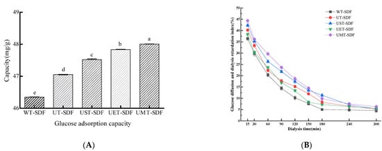 SDF can combine with glucose in intestinal fluid, thereby reducing postprandial blood glucose levels. GAC is a significant functional property of SDF and is often used to estimate its capacity to postpone glucose absorption. As depicted in Figure 7A, all the SDF samples effectively adsorbed glucose. Compared with hot water extraction, ultrasound treatment effectively enhanced the GAC of the SDF, whereas ultrasound combined with other methods had a better enhancement effect. The UMT-SDF exhibited the strongest adsorption capacity (48.00 ± 0.01 mg/g), which was consistent with the research showing that SDFs with a higher WHC and larger surface area had more of a chance to contact and adsorb glucose [33]. These results suggest that UMT-SDFs exert a strong hypoglycaemic effect in vitro.