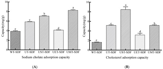 The OHC of SDF is of great significance for food applications, including avoiding fat loss during cooking [32]. As presented in Figure 6B, the OHC of the WT-SDF, UT-SDF, and UET-SDF displayed little difference and was markedly lower than those of the UMT-SDF (p < 0.05) and UST-SDF. The UMT-SDF exhibited the highest OHC, followed by the UST-SDF, although this difference was not of significance (p > 0.05), which might be attributed to the exposure of more active groups and an elevation in the specific surface area after the alkaline and microwave treatments.