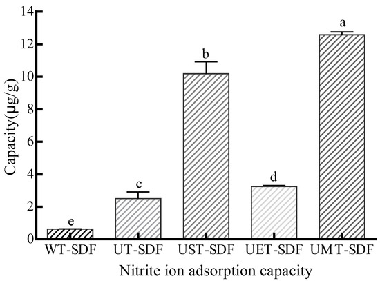 Nitrite can react with secondary and tertiary amines/amides to produce nitrosamines with strong carcinogenicity in gastric acid environments. Therefore, the NIAC of SDF is a meaningful functional property. As shown in Figure 9, the adsorption capacity of the SDFs for nitrite ions in a simulated gastric environment was investigated (pH = 2). The results showed that the NIAC of the UMT-SDF was significantly higher than that of the other samples (p < 0.05), which might be due to the UMT-SDF having a better structure and a massive explosion of functional groups to interact with more nitrite ions.