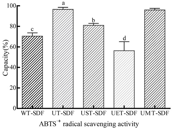 Effects of WT-SDF, UT-SDF, UST-SDF, UET-SDF, and UMT-SDF on radical ABTS∙+ scavenging activity. Values marked by the different letters (a–d) above are significantly different (p < 0.05).