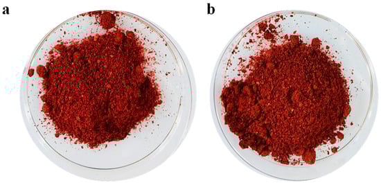 Visual characteristics of the blackberry vegetable powders analysed: (a) blackberry powder HAD-BP (hot air drying); (b) blackberry powder US-HAD-BP (ultrasound-assisted hot air drying).