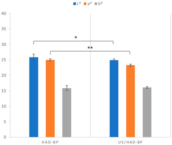 CIELab* values of blackberry powders (HAD-BP and US-HAD-BP) after drying and mill. Results indicate the mean values ± standard deviations. Asterisks indicate statistically significant differences between treatments with * for p ≤ 0.05, ** for p ≤ 0.01; no asterisk indicates a non-significant difference.