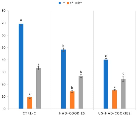 CIELab* values of blackberry cookies (HAD-Cookies and US-HAD-Cookies) after baking. Results indicate the mean values ± standard deviations. Values in the histograms followed by a different letters (a, b, c) are significantly different (p < 0.05).