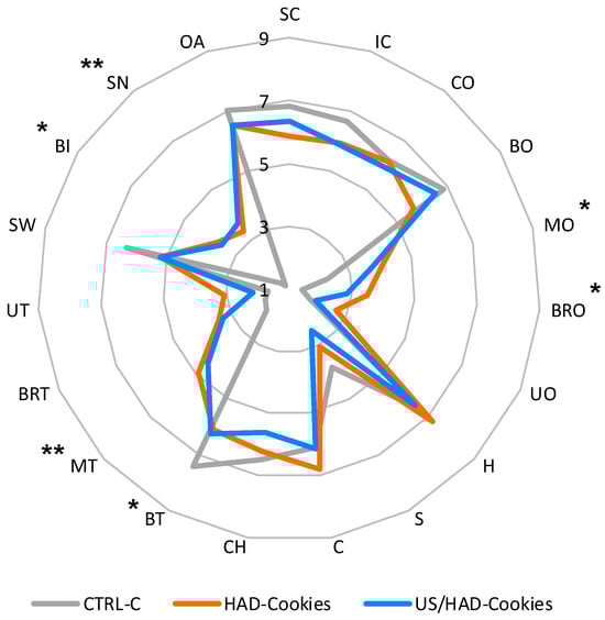 The sensory evaluation was conducted by a panel of 14 semi-qualified judges based on 19 descriptors: surface colour (SC), internal colour (IC), colour homogeneity (CO), cookie odour (BO), blackberry odour (MO), burnt odour (BRO), unpleasant odour (UO), hardness (H), softness (S), crunchiness (C), chewiness (CH), cookie taste (BT), blackberry taste (MT), burnt taste (BRT), unpleasant taste (UT), sweetness (SW), bitterness (BI), sourness (SN), and overall acceptability (OA). The evaluation was conducted from 10:00 to 12:00 in a room under white lights. Each panel member received, in random order, a control sample (CTRL-C) and the two samples with the added powders (HAD-Cookies and US-HAD-Cookies) (Figure 1). Between each sample, water was provided for mouth rinsing. The judges rated the intensity of each descriptor on a hedonic scale, assigning score from 1 to 9, representing different levels of intensity of the quality descriptors: 1—no sensation, 2—barely recognisable, 3—very weak, 4—weak, 5—slight, 6—moderate, 7—intense, 8—very intense, and 9—extremely intense.