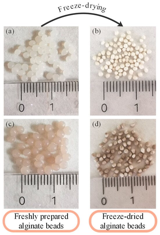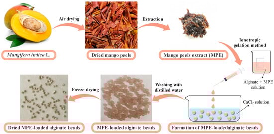 Encapsulation of MPE in alginate beads was performed to stabilize its important bioactive compounds []. The alginate beads were prepared using the ionotropic gelation technique []. The beads were formed by adding the suspension of alginate and MPE dropwise into a CaCl2 solution (0.1 M) with constant stirring. The control alginate beads without MPE were prepared using the same procedure. The obtained beads were repeatedly washed with distilled water and dried by the freeze-drying process (Figure 1).