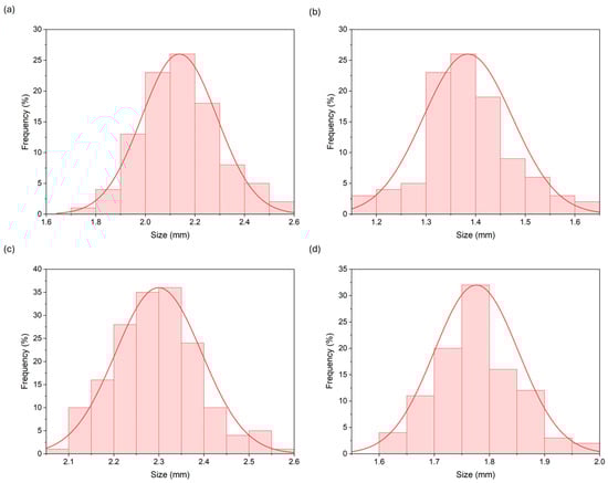 The size of alginate beads was determined using the Open Drop algorithm with a Basler Aca1300-200 µm digital camera connected to a computer with a CCTV lens (Tamron, Saitama, Japan). The samples were illuminated and recorded with a camera. The particle size was measured with the ImageJ program (version 1.54d, National Institutes of Health, Bethesda, MD, USA) using 100 beads to determine their diameter (mm). The size distribution graphs were created using the OriginPro® program (version 10.1.0.178, OriginLab Corporation, Northampton, MA, USA).