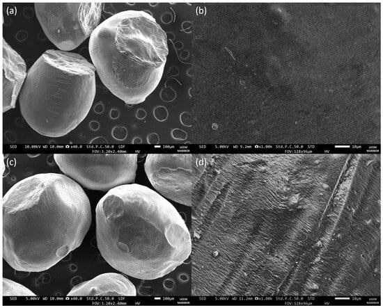 Next, the morphology of the freeze-dried control and the MPE-loaded alginate beads was analyzed by SEM (Figure 4). After the freeze-drying process, the surface morphology of the alginate beads was slightly altered. They were still spherical but had an irregular surface. However, there were no cracks on the surface that could impair the proper protection of the encapsulated substances, favor oxygen transport, and thus cause their degradation []. In addition, the non-spherical shape of the alginate beads may reduce their strength and, thus, their sensitivity to permeability [].