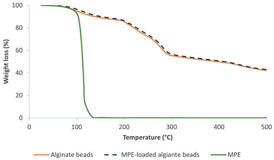 Various extracts and bioactive substances are generally unstable, so their encapsulation is essential. The alginate beads are able to withstand higher temperatures, which improves their thermal stability and effectively controls the loss of the extract []. This increases their potential for use in dietary supplements and food processing when exposed to higher temperatures. Therefore, the thermal degradation of the samples (control alginate beads, MPE-loaded alginate beads, and pure MPE) was investigated as weight loss in a temperature range from 20 to 500 °C (Figure 5).