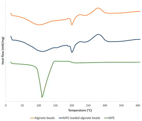 Furthermore, the characterization of the state of alginate beads was examined with DSC analysis, as the synthesis of alginate beads with the ionotropic gelation method involves the transition of the liquid material into a gel []. The DSC thermogram of control alginate beads, alginate beads with encapsulated MPE, and pure MPE is shown in Figure 6.