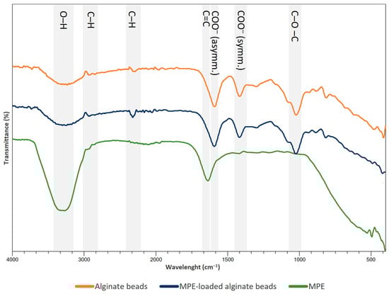 FTIR analysis was conducted to identify possible physiochemical interactions between the alginate matrix and MPE compounds. The obtained FTIR spectra in the range of 4000–400 cm−1 of the control, the MPE-loaded alginate beads, and the free MPE are presented in Figure 7.