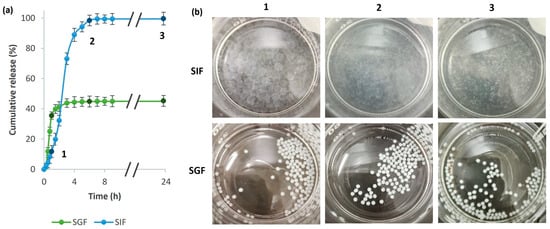 The release profile of MPE from alginate beads was evaluated under simulated gastric conditions (pH 1.2) and simulated intestinal conditions (pH 7.4). The results of the cumulative release of MPE during 24 h exposure to SGF and SIF and visual observation at different time intervals of alginate beads (1: 1 h; 2: 6 h; 3: 24 h) are shown in Figure 8a,b. Although MPE was almost completely released from the alginate beads after 6 h, we extended the release to 24 h to observe the degradation of the polymeric matrix in view of further antibacterial investigations.